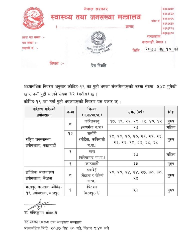 आज विहानै ३२ जनामा कोरोना भाइरस संक्रमणको पुष्टी, संक्रमित संख्य ५ सय ४८ पुग्यो ।