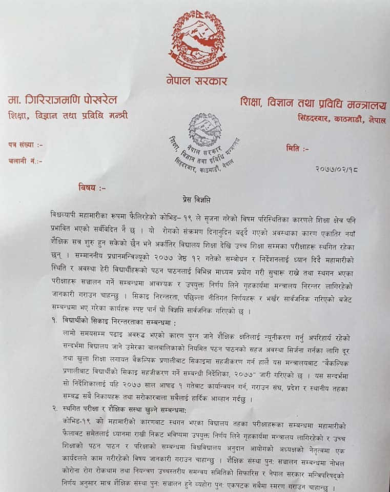 शिक्षा, विज्ञान तथा प्रविधि मन्त्री गिरीराजमणी पोखरेलले आज विज्ञप्ती जारी गर्दै यस्तो अनुरोध गर्नुभएको हो । पठनपाठन सहज गर्न दुर तथा खुल्ला शिक्षा लगायत बैकल्पिक प्रणालीबाट सिकाइ सहजीकरण गर्ने सम्बन्धी निर्देशिका २०७७ जारी गरेको मन्त्रालयले जनाएको छ ।