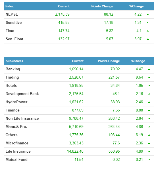 सबइन्डेक्सहरु पनि सबैमा बृद्धि भएको छ । आजको कारोबारमा सबैभन्दा धेरै ट्रेडिङ सबइन्डेक्स ९.६४ प्रतिशतले वढेको छ । यसपछि अन्य इन्डेक्स ६.१९ प्रतिशतले वढेको छ । सबैभन्दा कम म्युचल फण्ड ०.२१ प्रतिशतले बृद्धि भएको छ ।
