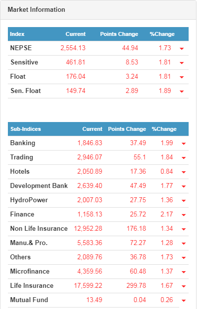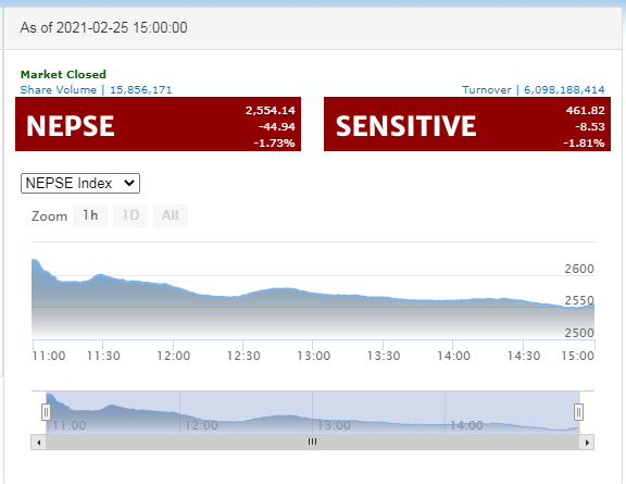 आज विहिबार पनि सेयर बजारको यात्रा ओरालो लागेको छ । आज नेप्से ४४.९४ विन्दुलेले घटेर २५५४.१४ मा अडेको छ । यो हप्ताको पहिलो दिन उकालो लागेको नेप्से त्यसपछि भने आरोतर्फ नै रहेको छ ।