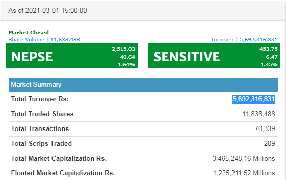 नेपाल स्टक एक्सचेन्सको डाटा अनुसार २ सय ९ कम्पनीको सेयर कारोबार भएको छ । तर आज नेप्से वढेपनि कारोबार रकममा भने कमी आएको छ । अघिल्लो दिनको तुलनामा झण्डै ३ अर्बले कम ५ अर्ब ६९ करोड २३ लाख १६ हजार ८३१ रुपैयाँको मात्र कारेबार भएको छ ।