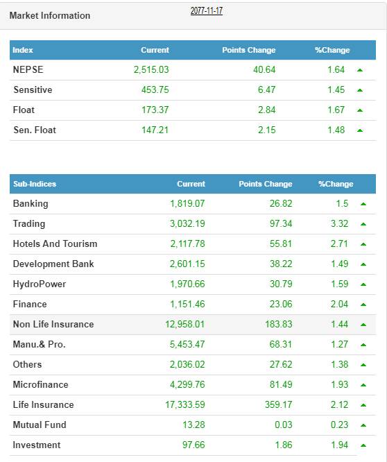 हप्ताको पहिलो दिन आइतबारको कारोबारमा नेप्सेले ओरोलो यात्रा तय गरेको भएपनि आज दोस्रो दिन भने उकालोतर्फको यात्रा तय गरेको छ । नेप्से ४०.६४ अंकले वढेर २५१५.०३ अंकमा अडिएको छ ।