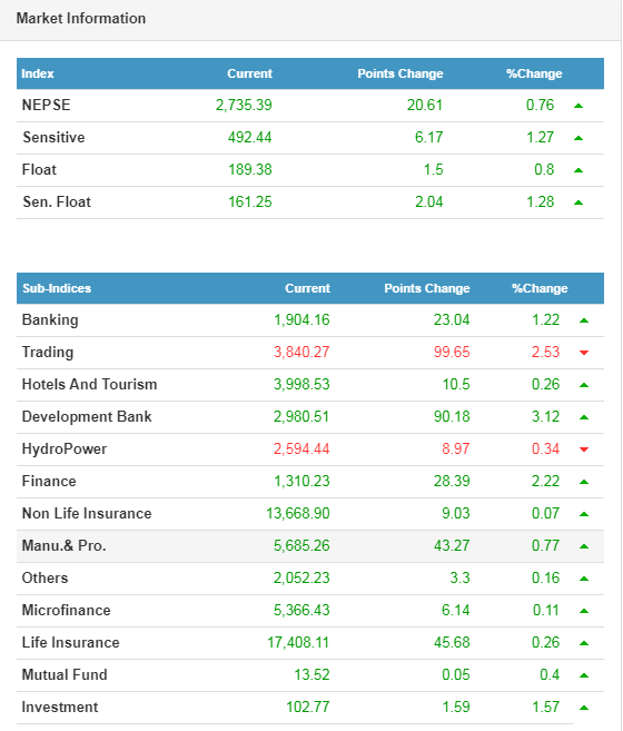 २०७८ को पहिलो कारोबार दिनमा नै नेप्सेले नयाँ अलटाइम हाइ रेकर्ड कायम गरेको छ । आजको कारोबारमा २०.६१ प्रतिशतले बृद्धि भई २७३५.४० पुगेर नयाँ अलटाइम हाइ रेकर्ड तय भएको हो । २०७७ सालको अन्तिम कारोबारमा पनि आज बृद्धि भएको छ । आज ८ अरब ६३ कारोड ६६ लाख ६८ हजार रुपैयाँको कारोबार भएको छ । नेप्सेको तथ्याङक अनुसार १ करोड ९० लाख २० हजार किता शेयर खरिदबिक्री भएको छ ।