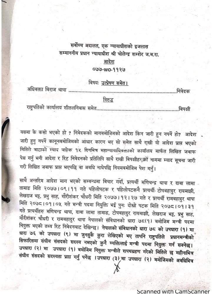 संसद सदस्य नरहेको व्यक्तिलाई दोहोर्याएर मन्त्री बनाउनु संविधान विपरीत हुने भन्दै अधिवक्ता विराज थापा र अधिवक्ता कपिलदेव ढकालले सर्वोच्च अदालतमा दायर गर्नुभएको थियो ।