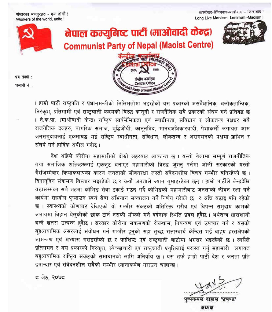 उहाँका अनुसार महामारीसँग जुधिरहेका जनतालाई सहयोग गर्न वडा तहसम्म कोभिड–१९ सेवा इकाई गठन गर्ने निर्णय भएको छ भने असंवैधनिक कदमको प्रतिवाद गर्न र राष्ट्रिय स्वाधिनता रक्षाको पक्षमा उभिन अपील गरेको छ ।