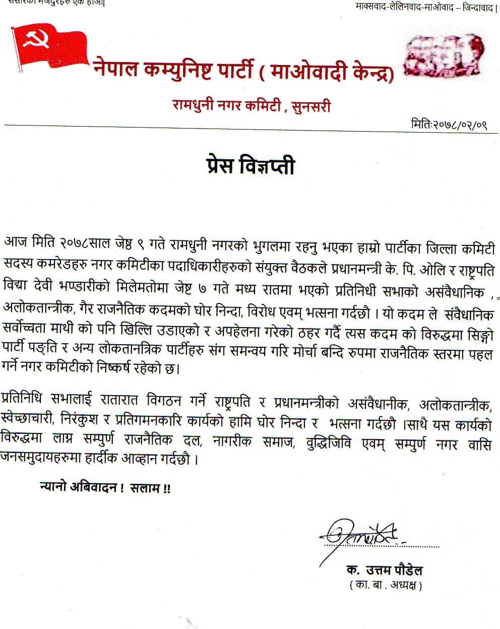 नेपाल कम्युनिष्ट पार्टी (माओवादी केन्द्र) रामधुनी नगर कमिटी, सुनसरीले प्रधानमन्त्री र राष्ट्रपति विद्यादेवी भण्डारीको मिलेमतोमा गरिएको संसद विघटनको विरोध एवं भत्सर्ना गरेको छ ।