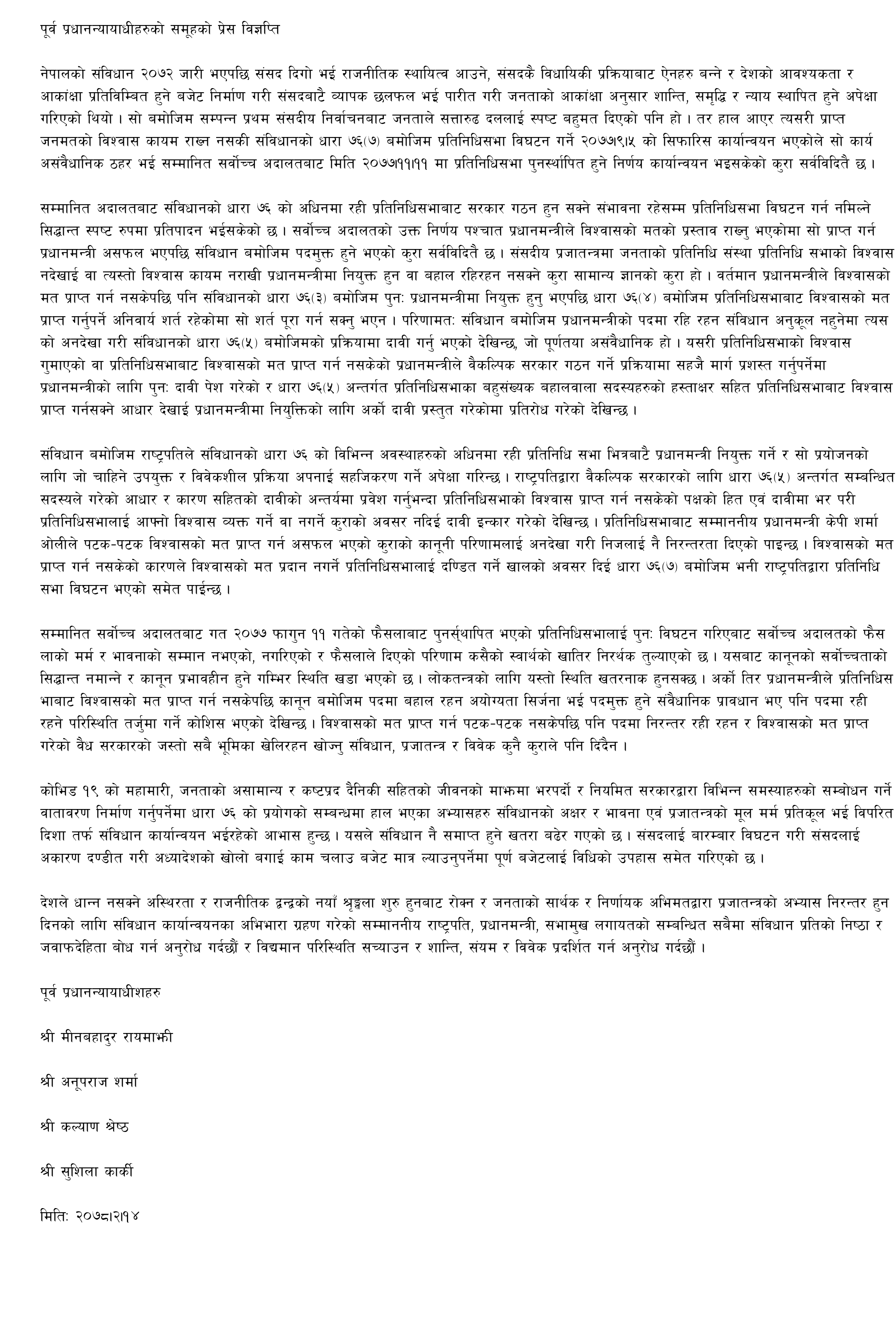 चार जना पूर्वप्रधान्यायायाधीशहरु मीनबहादुर रायमाझी, अनुपराज शर्मा, कल्याण श्रेष्ठ र सुशीला कार्कीले जारी गरेको विज्ञप्तिमा भनिएको छ ‘‘धारा ७६ को प्रयोगको सम्बन्धमा हाल भएका अभ्यासहरु संविधानको अक्षर र भावना एवं प्रजातन्त्रको मूल मर्म प्रतिकूल भई विपरित दिशा तर्फ संविधान कार्यान्वयन भइरहेको आभास हुन्छ । यसले संविधान नै समाप्त हुने खतरा बढेर गएको छ ।’