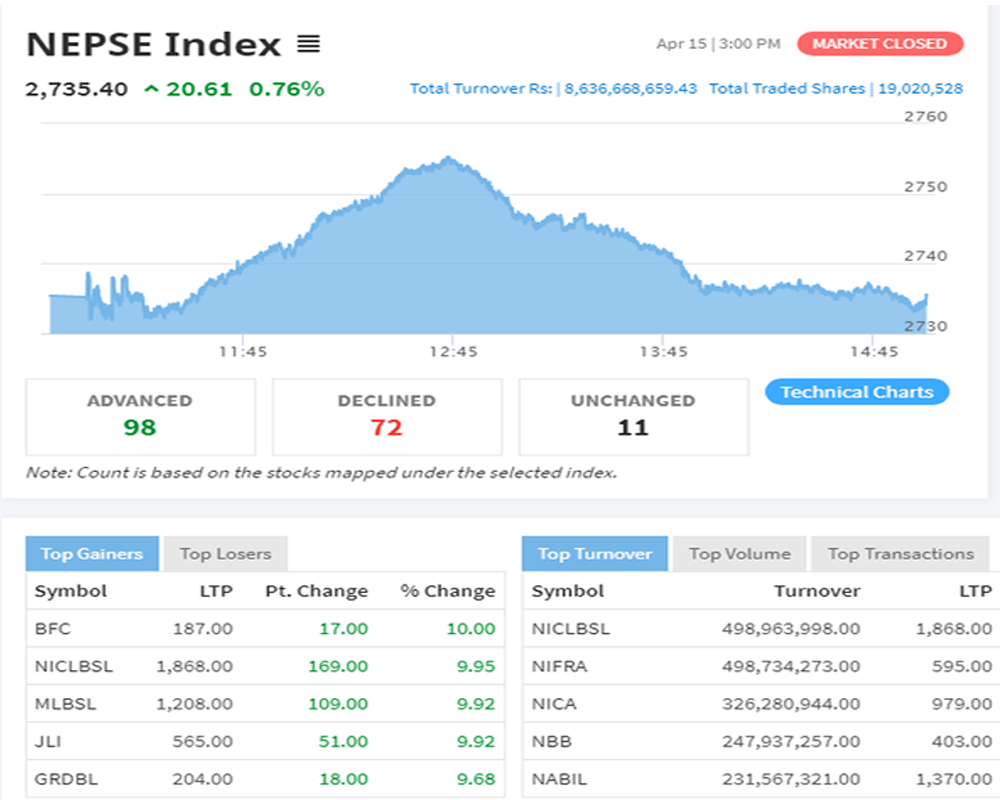२०७८ बैशाख २ गते, इटहरी । २०७८ को पहिलो कारोबार दिनमा नै नेप्सेले नयाँ अलटाइम हाइ रेकर्ड कायम गरेको छ । आजको कारोबारमा २०.६१ प्रतिशतले बृद्धि भई २७३५.४० पुगेर नयाँ अलटाइम हाइ रेकर्ड तय भएको हो । २०७७ सालक...