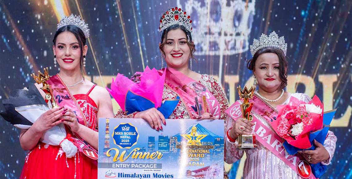 इटहरी । मिसेस नोबेल नेपाल २०२५ को ताज काठमाडौँ बसुन्धाराकी सौन्दर्यकर्मी सन्ध्या लामिछानेले पहिरिएकी छन्। शनिबार राजधानीको ज्यापु प्रज्ञा एकेडेमीमा सम्पन्न कार्यक्रममा ताजसँगै 'नेपाल फेसन एण्ड इन्टरटेन्मेन्ट अर्वाड २०२५ टोकीयो...