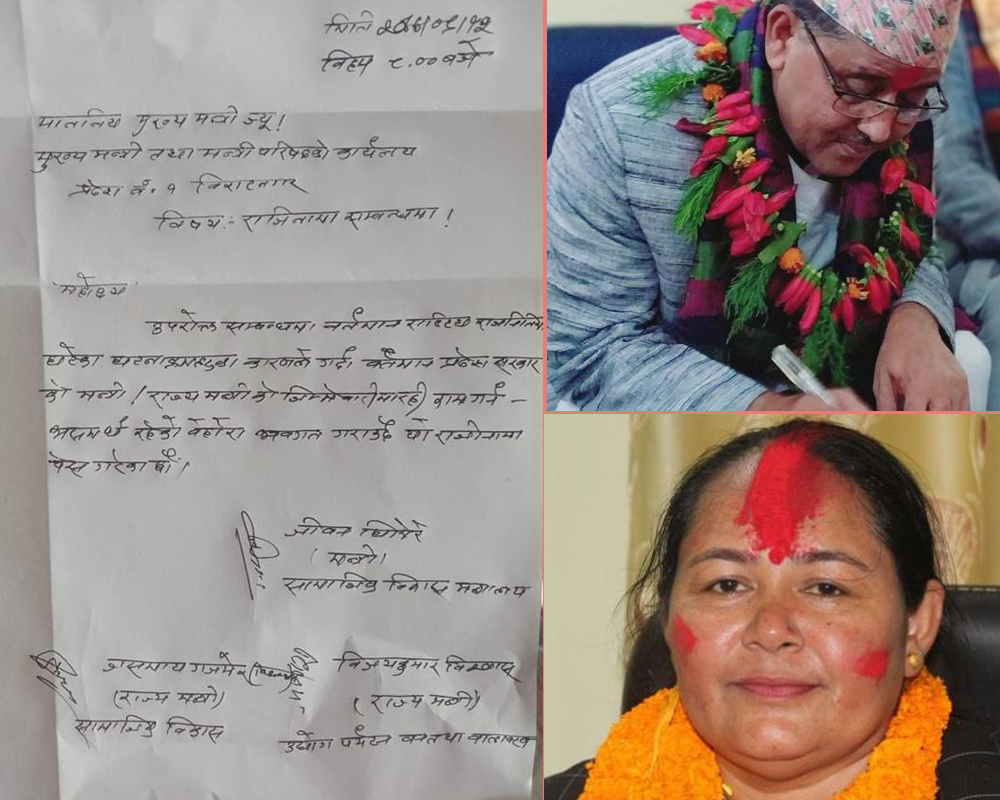 २०७७ पुस १२ गते, विराटनगर । प्रदेश नम्बर एक सरकारका तीन मन्त्रिले आज पदबाट राजिनामा दिएका छन् । यसरी राजिनामा दिने मन्त्रिहरुमा सामाजिक विकास मन्त्री जीवन घिमिरे, रामाजिक विकास राज्य मन्त्रि जसमाया मगर र उधोग, पर्यटन, वन तथा वातावरण राज्य म...