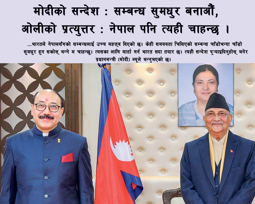 शम्भु कट्टेल मंसिर १२ गते, काठमाण्डौं । प्रधानमन्त्री केपी शर्मा ओलीलाई भारतीय समकक्षी नरेन्द्र मोदीले नेपालसँगको सम्बन्ध शीघ्र सुमधुर बनाउन चाहेको सन्देश पठाएका छन्। प्रधानमन्त्री ओलीसँग बिहीबार बालुवाटारमा शिष्ट...