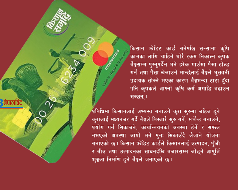 कात्तिक ८ गते, काठमाडौँ । भेषराज बेल्बासे व्यावसायिक कृषिमा लागेका र कृषि क्षेत्रलाई नै जीविकोपार्जनको मुख्य आधार बनाएकाका लागि सरकारले ल्याउन लागेको ‘किसान क्रेडिट कार्ड’ अन्तिम...
