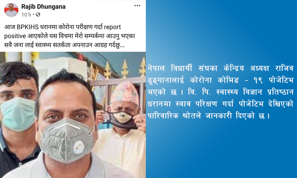 असोज २० गते, इटहरी । नेपाल विधार्थी संघका केन्द्रिय अध्यक्ष राजिव ढुङ्गानालाई कोरोना कोभिड – १९ पोजेटिभ भएको छ । वि. पि. स्वास्थ्य विज्ञान प्रतिष्ठान धरानमा स्वाव परिक्षण गर्दा पोजेटिभ देखिएको पारिवारिक श्रोतले जान...