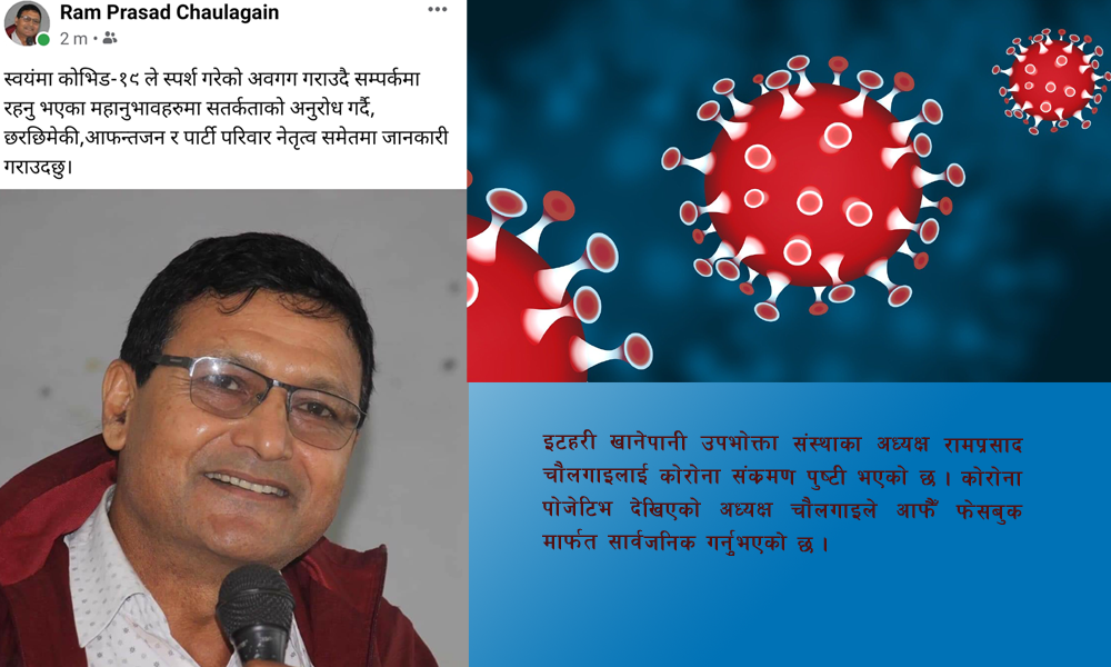 असोज १९ गते, इटहरी । इटहरी खानेपानी उपभोक्ता संस्थाका अध्यक्ष रामप्रसाद चौलगाइलाई कोरोना संक्रमण पुष्टी भएको छ । कोरोना पोजेटिभ देखिएको अध्यक्ष चौलगाइले आफैँ फेसबुक मार्फत सार्वजनिक गर्नुृभएको छ । आज सोमवार विहानै फेसबुक...