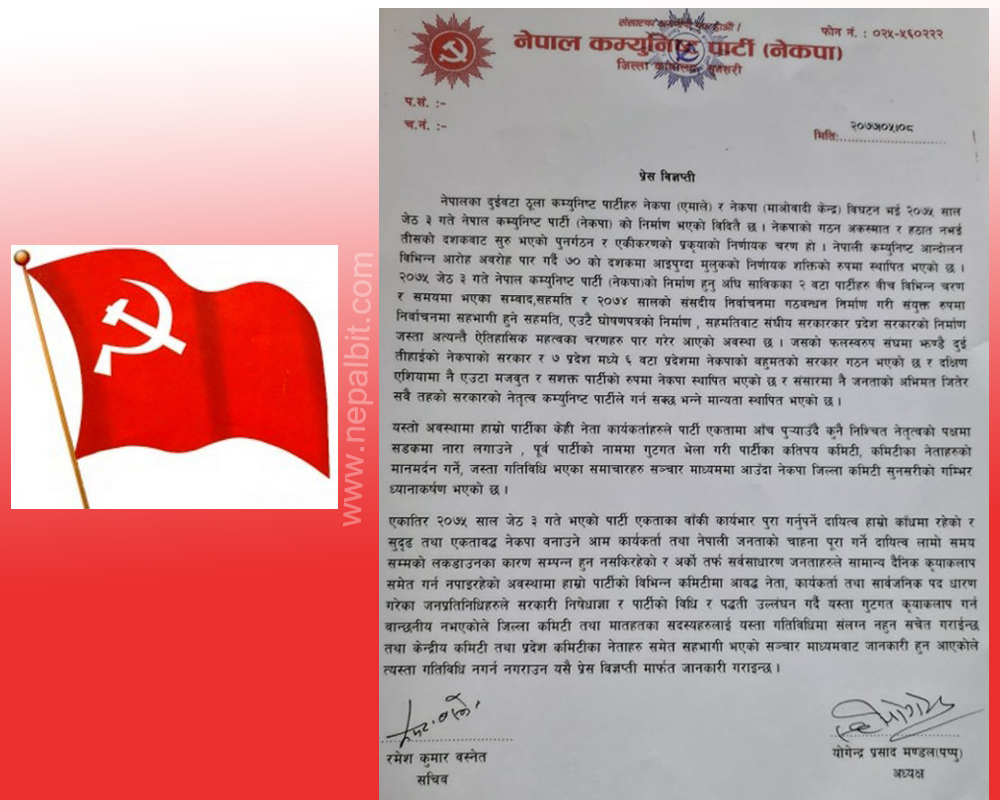भदौँ ८ गते, इटहरी । जिल्लाका केही नेताहरु पार्टी एकताको भावना विपरित गुटवन्दी गर्दै हिडेकामा पार्टीको गम्भिर ध्यान आकर्षण भएको भन्दै नेपाल कम्युनिष्ट पार्टी (नेकपा) सुनसरीले आज प्रेस विज्ञप्ती जारी गरेको छ ।...
