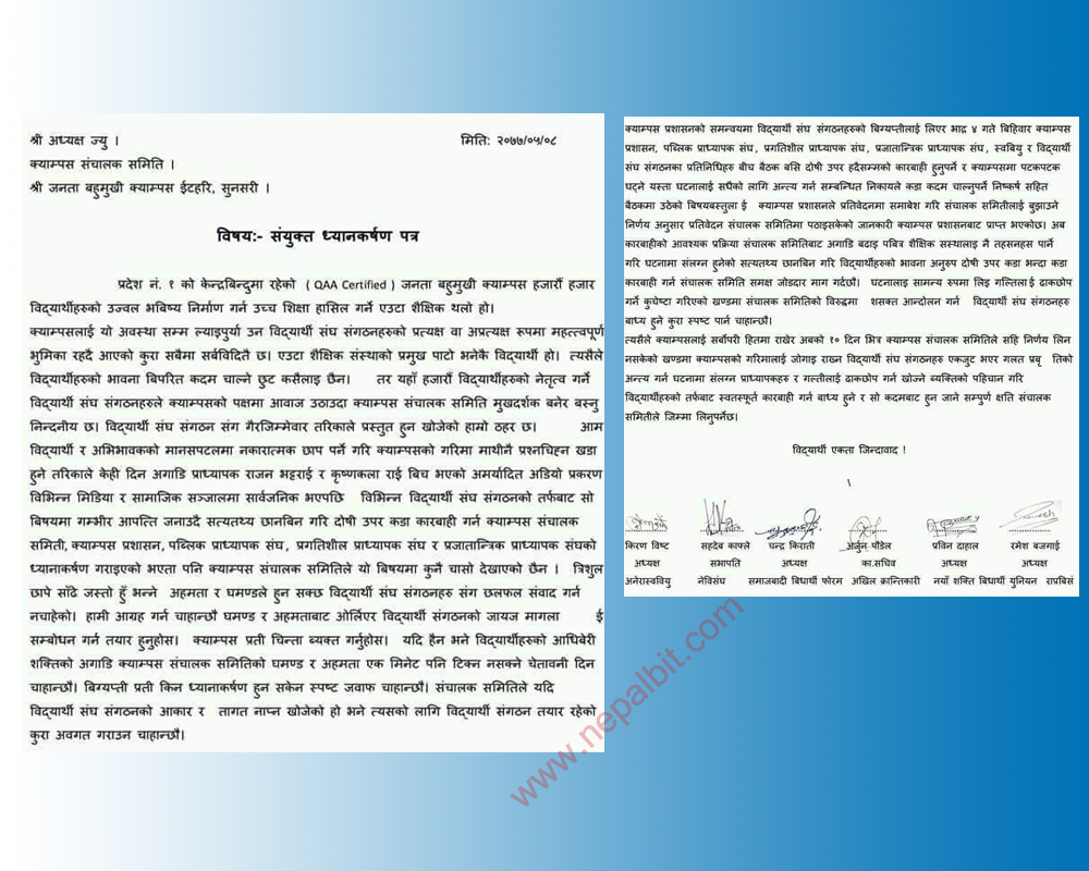 भदौँ ८ गते, इटहरी । प्रध्यापक राजन भट्टराई र कृष्णकला राईबिच भएको अडियो संवादको बिषयमा तत्काल छानविन गरी दोषीलाई कार्वाही गर्न माग गर्दै जनता वहुमुखी क्याम्पस इटहरीका ६ विधार्थी सङ्गठनहरुले आज संयुक्त ध्यान आकर्षण पत्र ज...