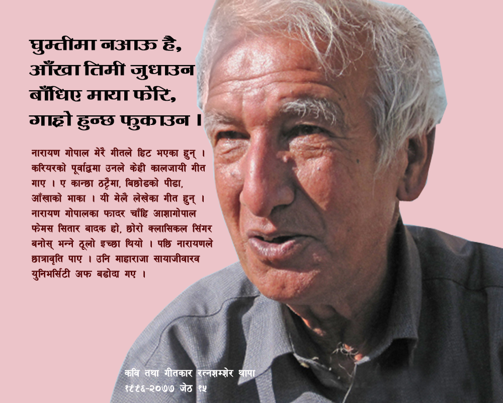 रामप्रसाद खरेल हाँस्छौ, गाउँछौ, वसन्त ल्याउँछौ प्रेमको अनुरोधमा धन्न लिन्नौँ हामी केही उनको विरोधमा । नारायण गोपालको अनुरोधमा रत्नले सृजेका यी शब्दमा स्वर भर्न वन्देज गरिदियो पञ्च...